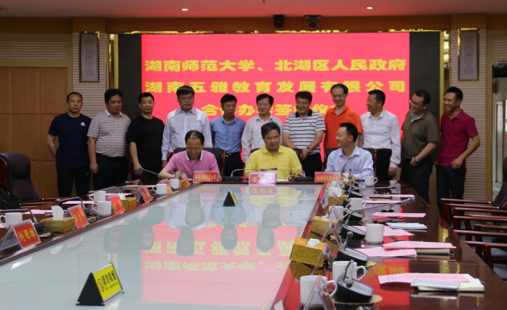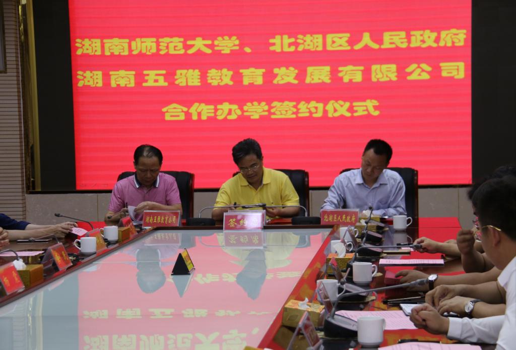 “郴州市湖南师大附属五雅中学”系一所民办完全中学,位于郴州市北湖区华府路1号,定于今秋季开学。该校由湖南五雅教育发展有限公司投资建设,郴州市北湖区人民政府在供地、教师编制等方面给予支持,委托我校管理。签约仪式上,湖南五雅教育发展有限公司向太阳集团tyc151教育基金会捐赠人民币1000万元。