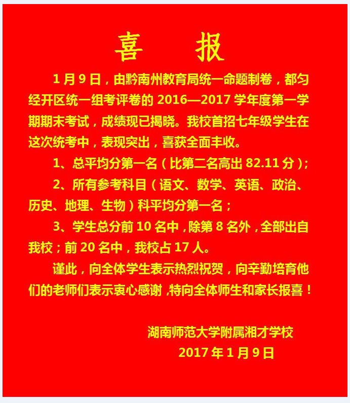 我校附属湘才学校2016年秋季开学,起步即取得了突出的办学成绩。