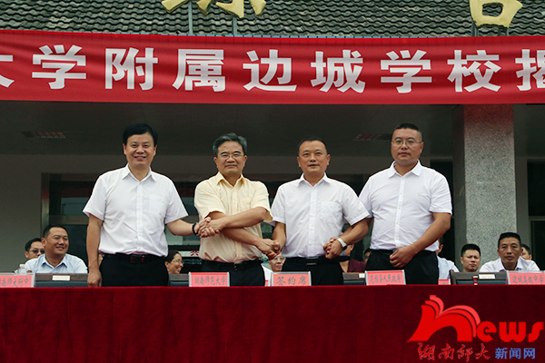 (记者 蔡颂 黄林键)为贯彻落实中央、省委精准扶贫、精准脱贫决策部署,加快推进花垣县基础教育和花垣边城高级中学发展,助力花垣县打好精准脱贫攻坚战,9月20日下午,我校及我校附属中学与花垣县人民政府、边城高级中学共同签署《教育帮扶与合作框架协议书》,边城高级中学正式挂牌为我校附属边城学校。湘西州人民政府副州长吴凌频,我校党委书记蒋洪新、副校长王善平出席签约揭牌仪式。仪式由花垣县委常委、县委统战部部长龙文斌主持。