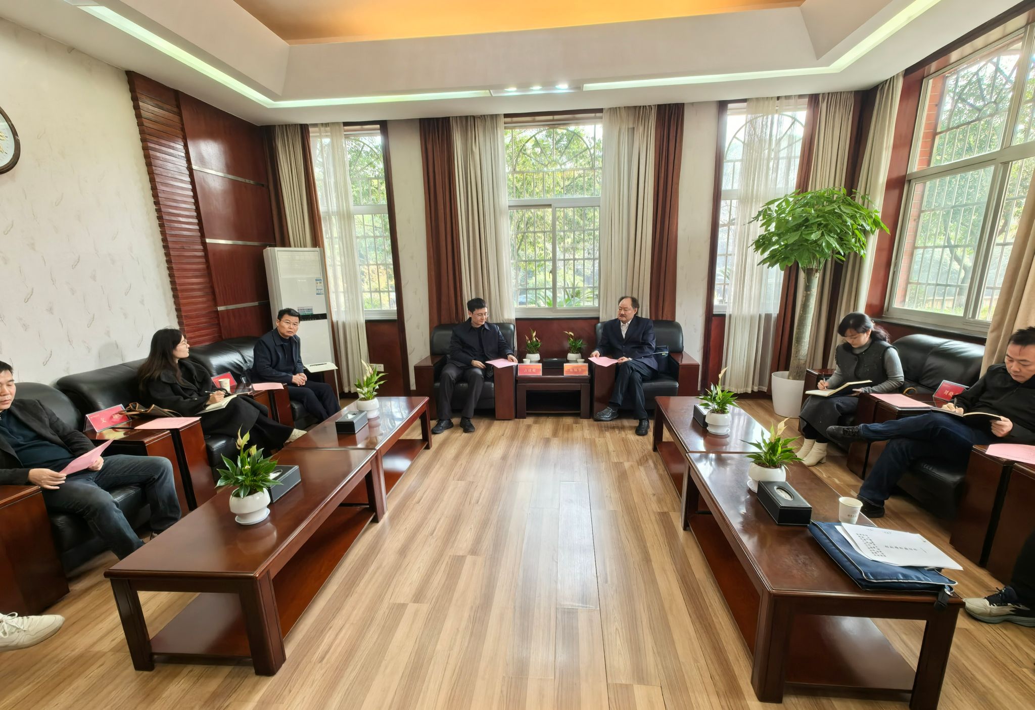 渌口区教育局副局长彭中辉、文咪,承建方中湘城市管理有限公司钟小明,基础教育发展中心副主任刘晓燕,附中党委委员、副校长李智敏等双方有关负责人围绕学段设置、施工进度、师资配置、领导班子组建及招生政策等核心议题展开研讨。